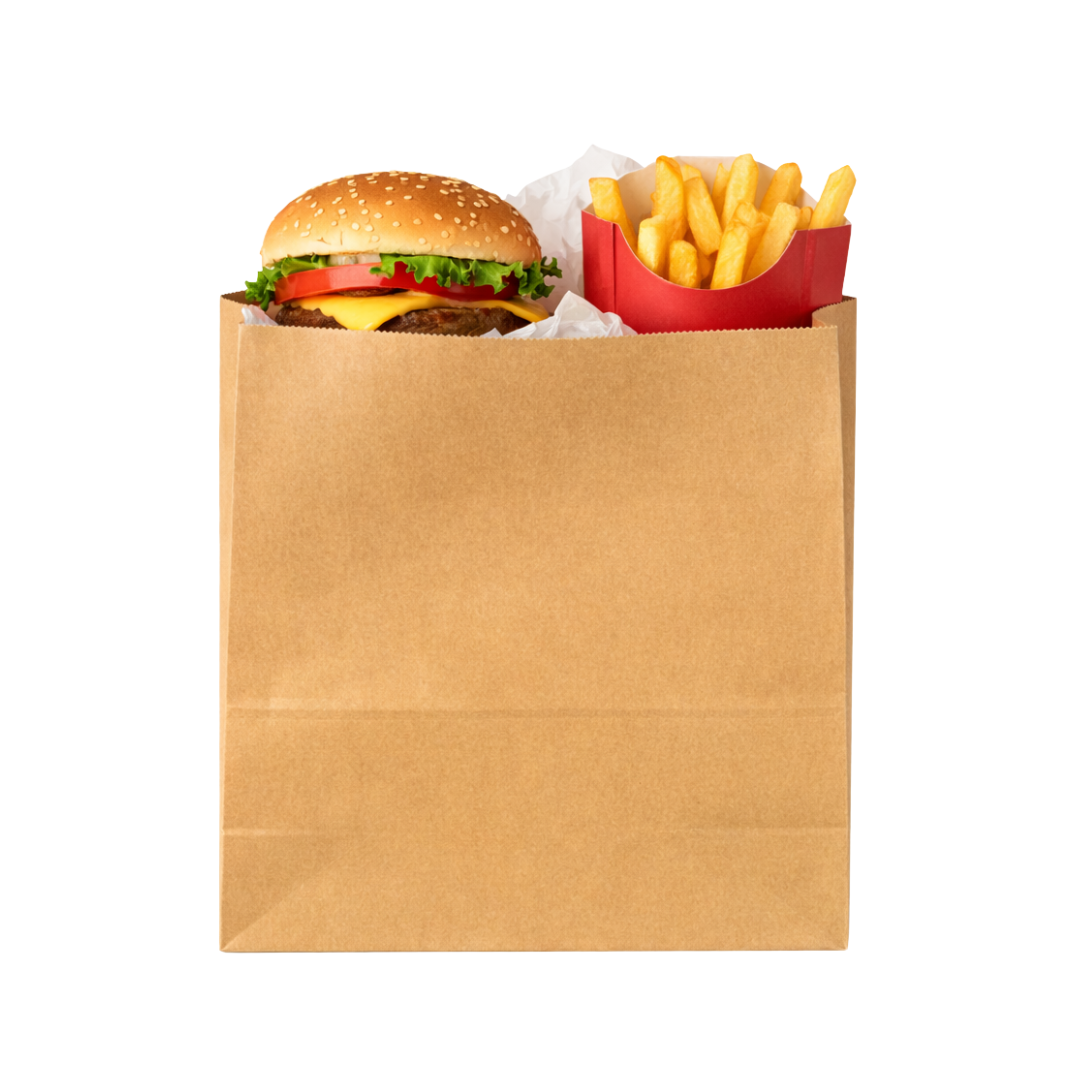 Fabricada en papel resistente, esta bolsa no cuenta con asas, lo que la hace ideal para entregas directas, uso interno en locales gastronómicos o como complemento de packaging para take away.