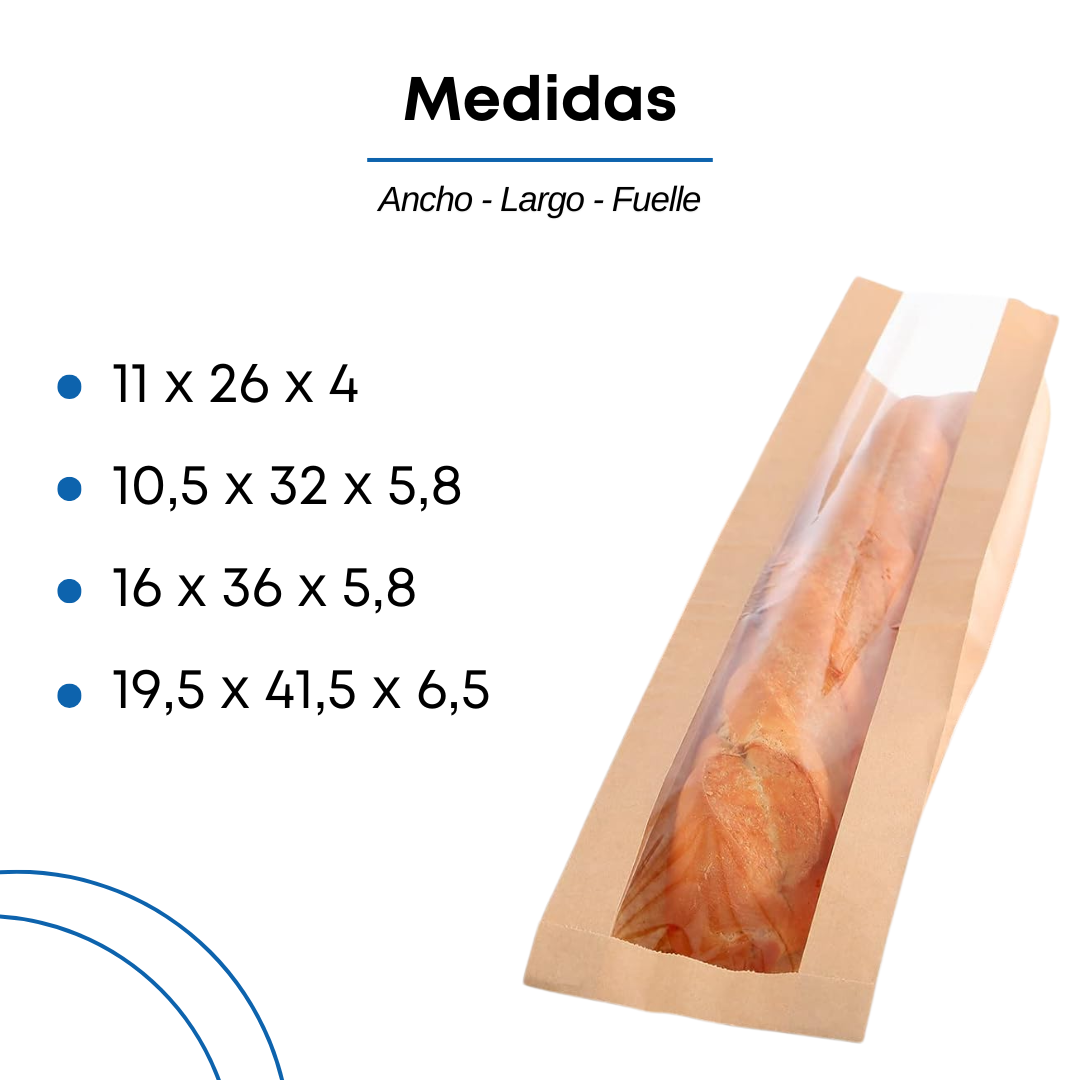 Disponibles en cuatro tamaños —11×26, 10.5×32, 16×36 y 19.5×41.5— permiten adaptarse a distintos tipos de panes y bollería en general, desde piezas individuales hasta formatos más grandes. El visor transparente facilita la visualización del contenido sin necesidad de abrir la bolsa, mejorando la experiencia de compra.