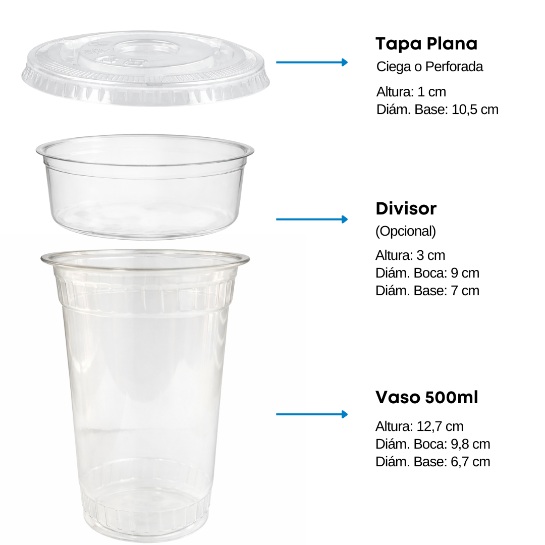 Disponible en 300 ml, 400 ml y 500 ml, cuenta con tapa plana ciega o perforada. Además, puede incorporar un divisor interno opcional, diseñado para separar ingredientes de forma prolija y funcional.